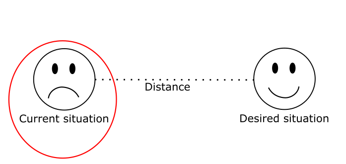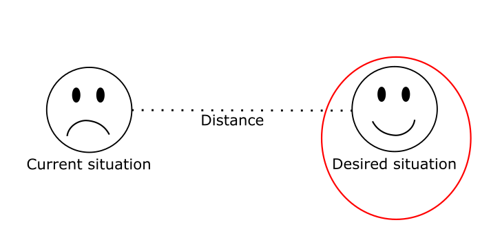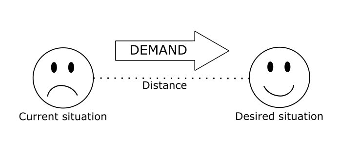 In order to understand what’s behind that, let’s go back to our demand scheme. We’ve seen that, in order to foster demand, companies may either try and manipulate the current situation by worsening people’s quality of life, or manipulate the desired situation by creating goals and expectations. However, if what really matters is the distance between those two, how do you manipulate that? The problem is, that distance cannot be manipulated directly. A distance is defined by the relationship between two points, and it can only be altered by moving either one of them, or both. So, what matters here is working on those two poles by keeping in mind the relationship between them, so that they never meet.